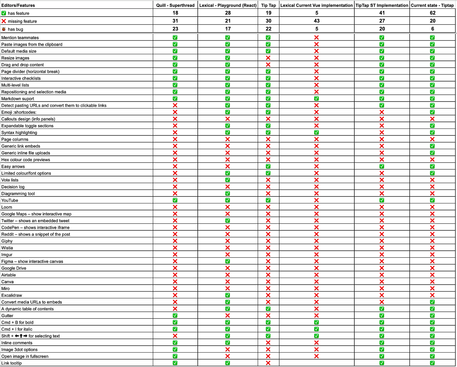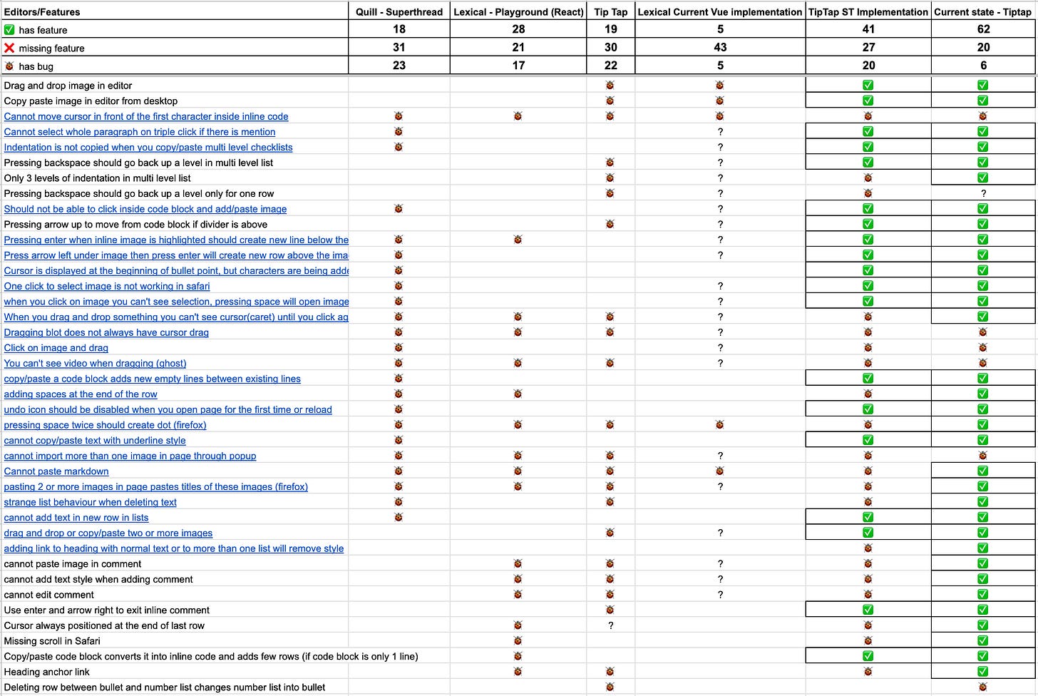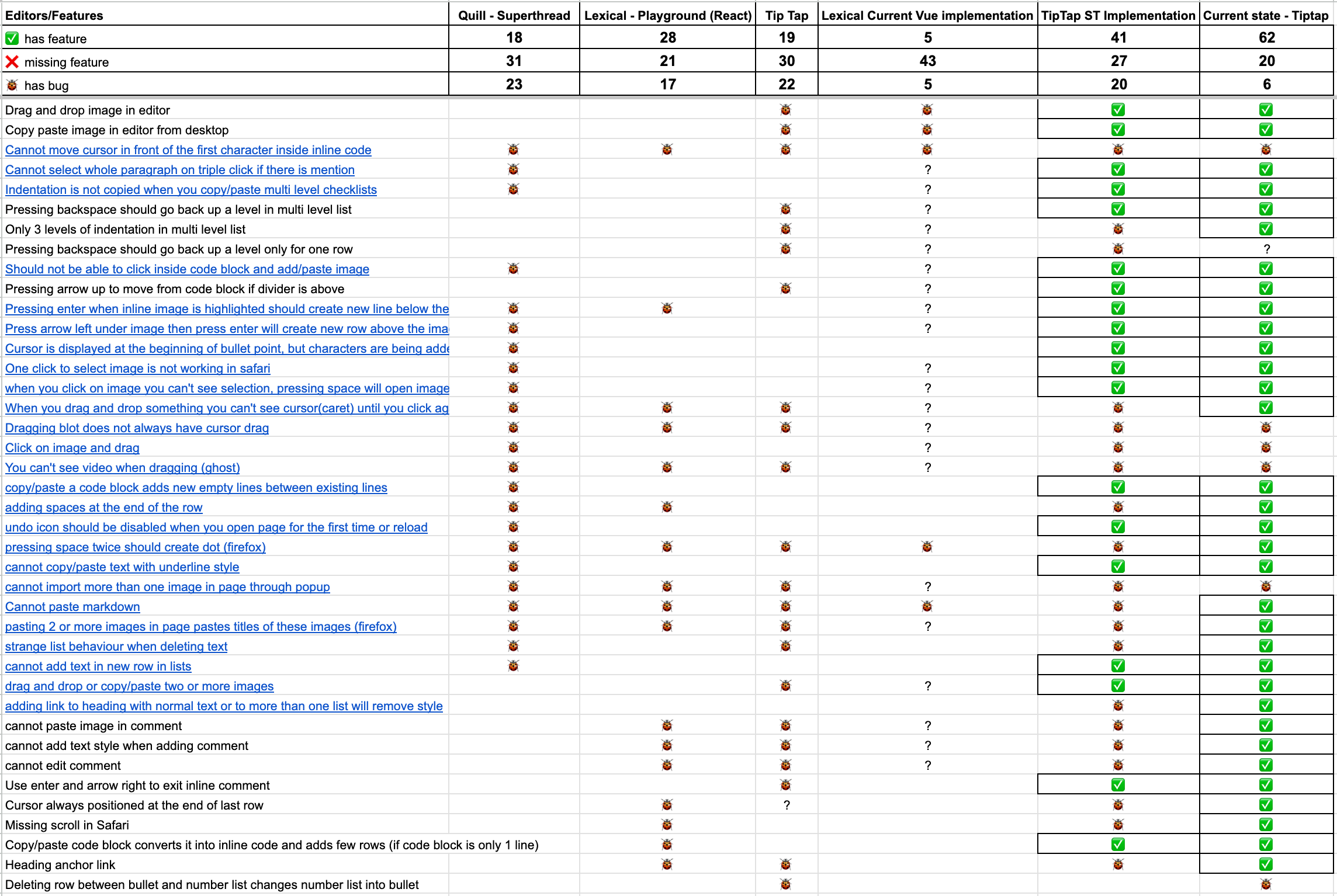 We compared features and bugs with our original quill implementation, Lexical playground which is Meta’s open source offering & TiptTap playground.