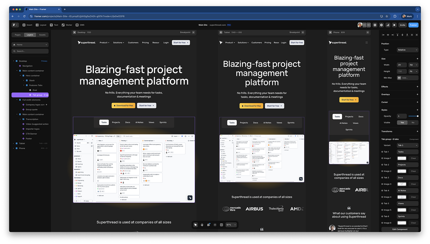 Webflow’s biggest flaw for us was single-user editing. One person at a time. No exceptions. In 2025, that feels broken – especially when we collaborate in real-time in Figma, Slack, Google Docs… even Superthread itself.